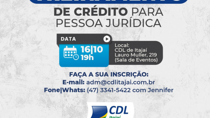 Estão abertas na CDL de Itajaí as inscrições para um Treinamento direcionado para Pessoa Jurídica na área de Crédito. O Treinamento é gratuito para os associados da entidade. Informações você consegue com a nossa equipe, no fone: 47- 3341-5422.