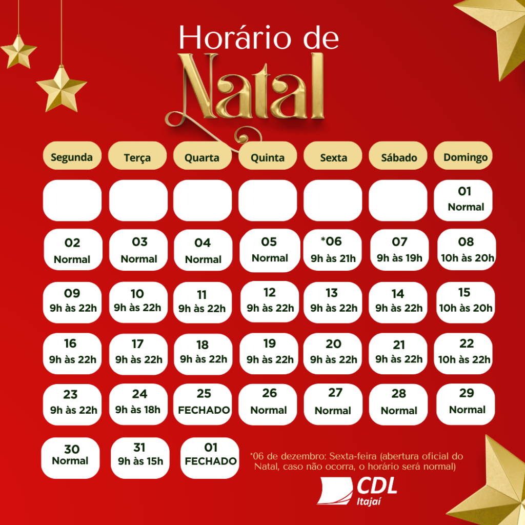 A partir do dia 6 de dezembro, os consumidores contarão com o horário diferenciado para as compras no comércio de Itajaí. As lojas estarão abertas das 9h às 21h, data em que também está prevista a abertura oficial do Natal na cidade. Caso a cerimônia de abertura não ocorra nessa data, o funcionamento das lojas seguirá o horário normal até novo aviso. Já a partir do dia 9 de dezembro, o comércio permanecerá aberto até às 22h, oferecendo mais comodidade para os consumidores realizarem suas compras de fim de ano.